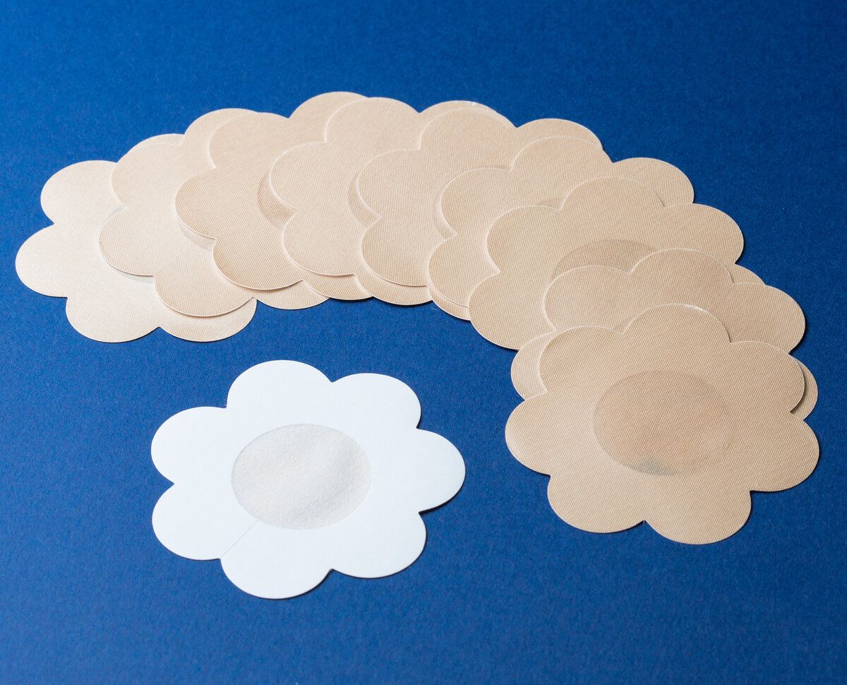 Тонкие одноразовые наклейки топлес телесного цвета для носки одежды без бюстгальтера. Также они подойдут для посещения солярия. В комплекте пять штук наклеек в форме цветочков.