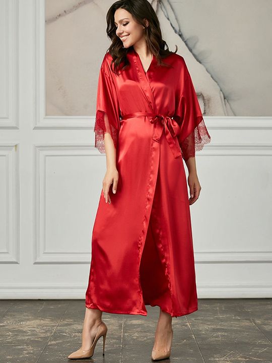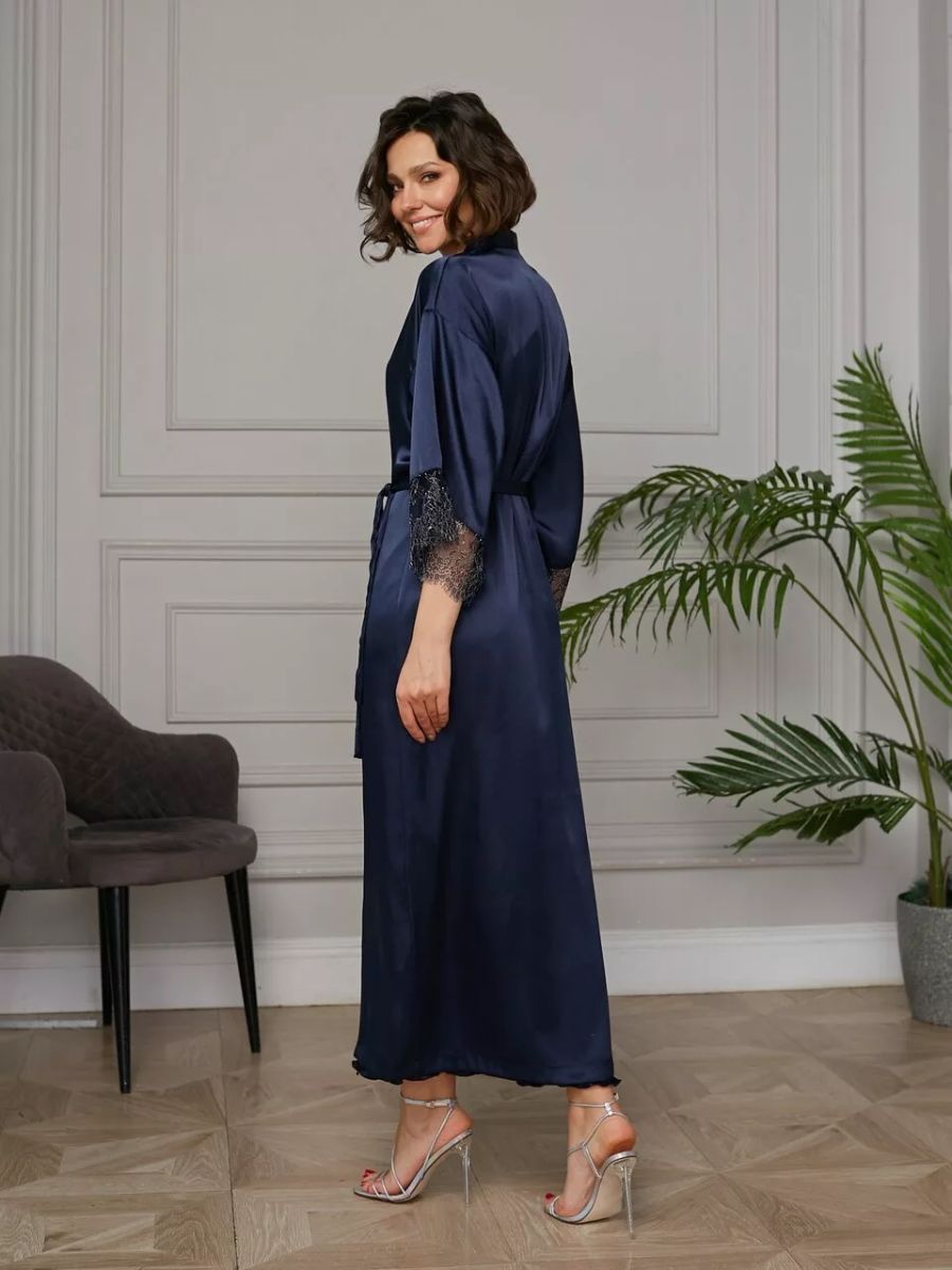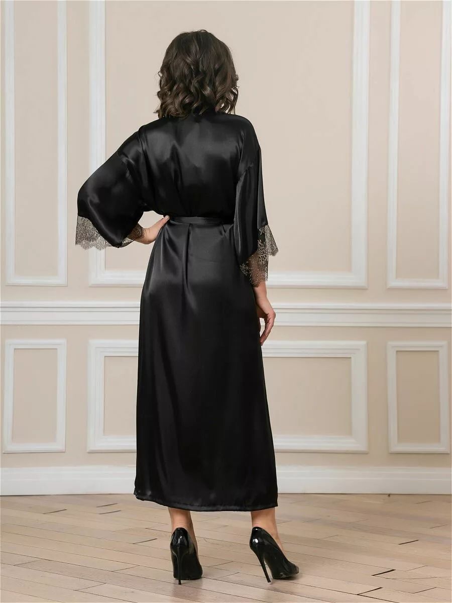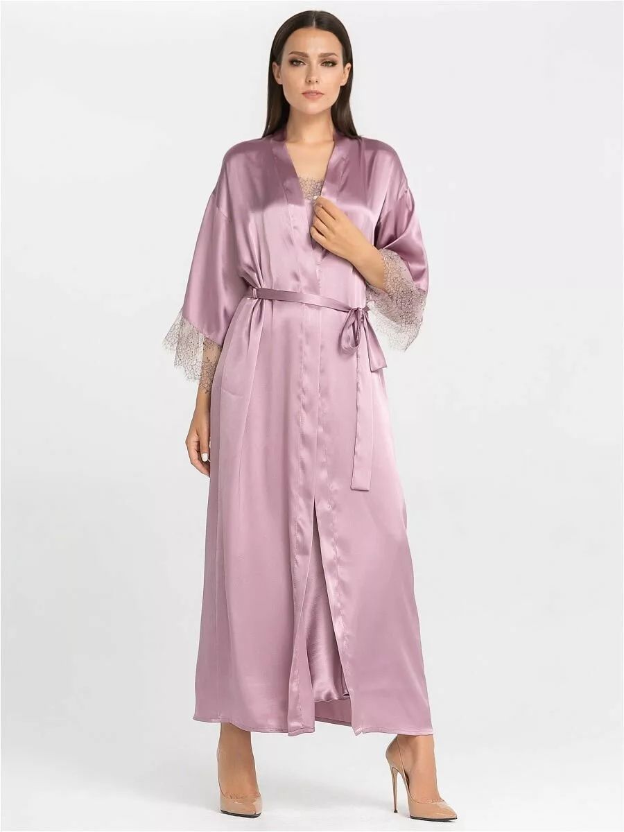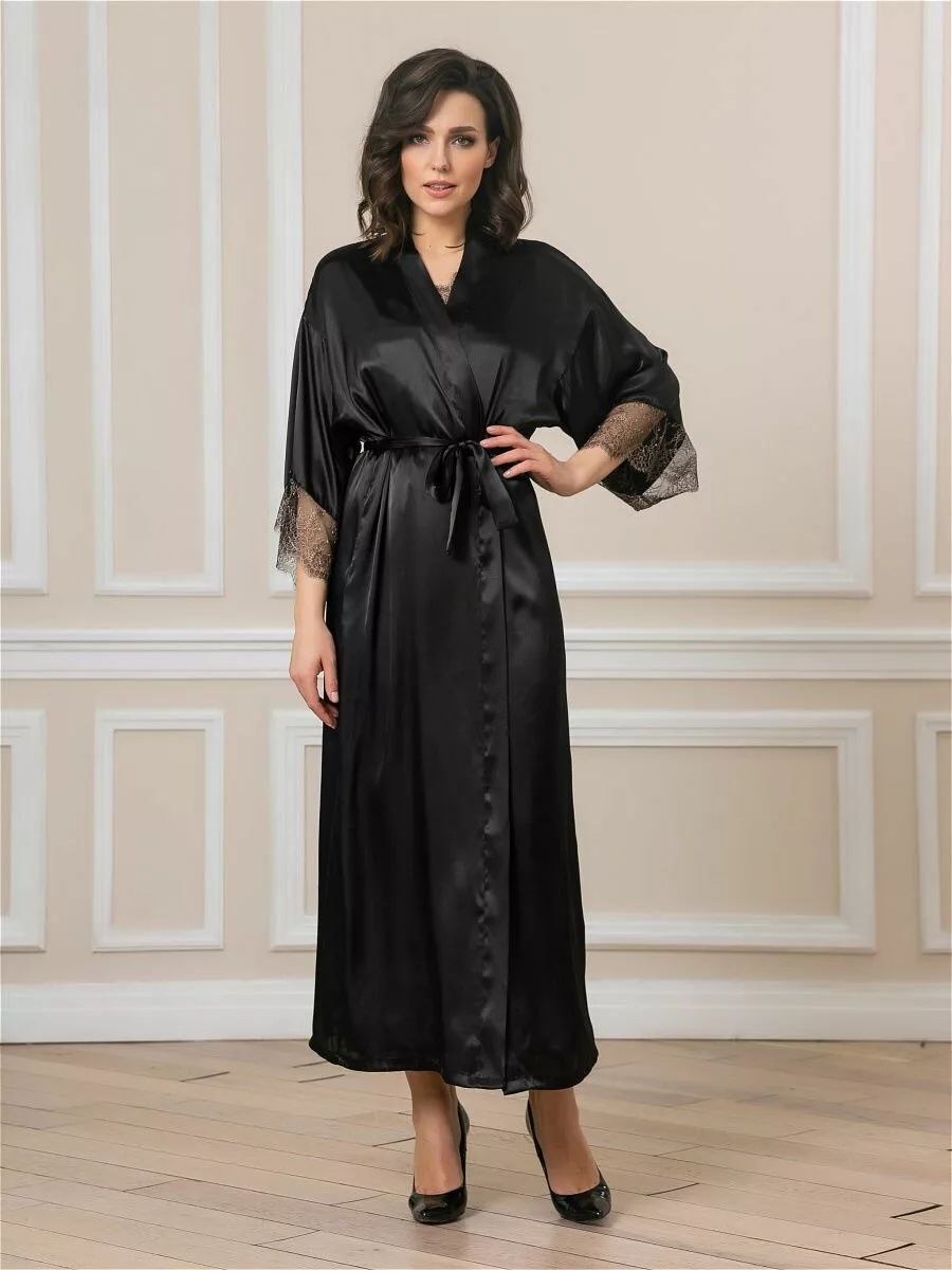 Длинный халат на запах из искусственного шелка с поясом, декорирован кружевом по рукаву.