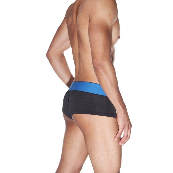 Мужские хипсы из эластичной черной ткани, с синими строчками и широким синим поясом.