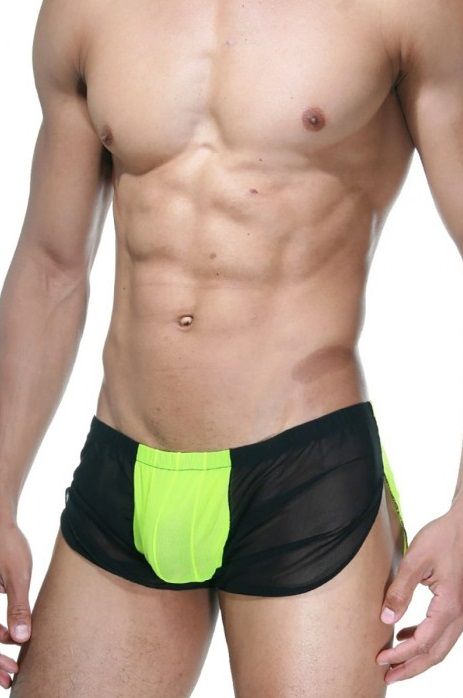 Мужские шорты-боксеры со свободной посадкой, из комбинированной черной и ярко-зеленой легкой полупрозрачной ткани.