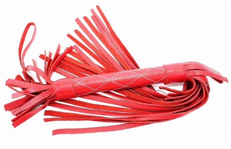 Аккуратная красная плетка, изготовленная из натуральной кожи. Имеет жесткую ручку, также покрытую кожей и простроченную белыми нитями. Имеется петля для удобного использования плети. Длина ручки - 17 см. Длина хлыстов - 27 см.