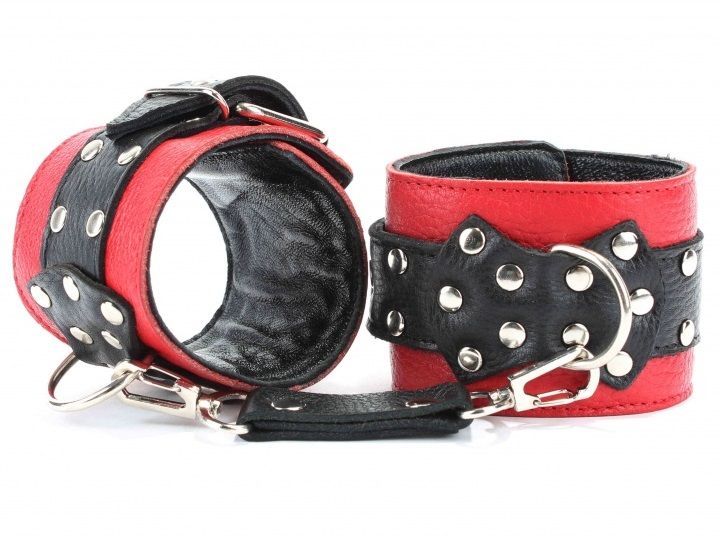 Красные наручники с чёрными проклёпанными ремешками с пряжкой. Ширина - 5 см.