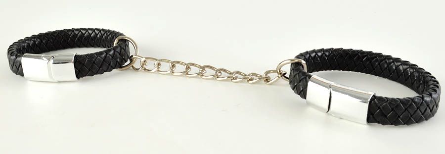 Наручники состоят из плетеного винилового шнура шириной 11 мм и магнитных застежек. Чтобы получился ошейник с подвеской цепочкой, необходимо наручники соединить между собой. Длина манжеты - 18 см.