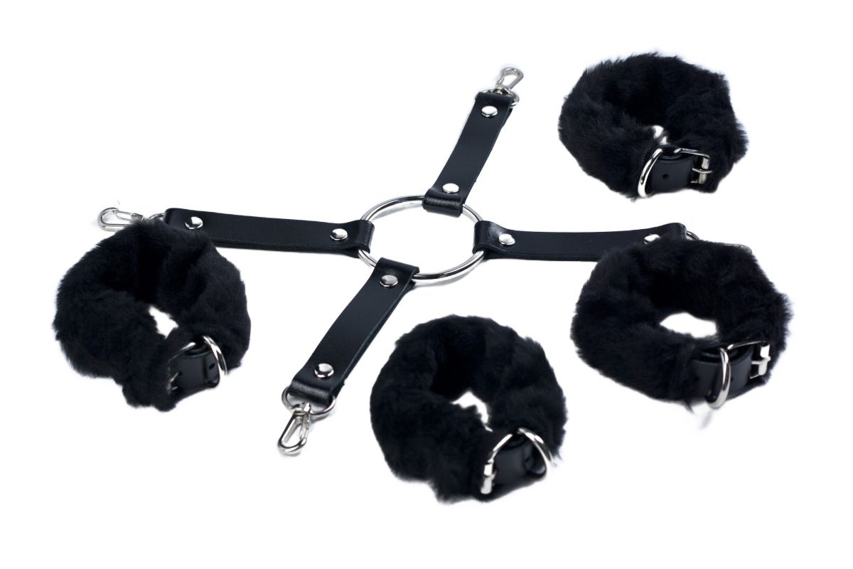 Набор для фиксации с четверным креплением, кольцом в центре и карабинами на концах. Особенности: - черная натуральная кожа (1.8-2 мм), 1 слой - черный съемный искусственный мех - набор 2 в 1: можно использовать с мехом для нежной фиксации, или снять мех и получить более жесткую версию - удлиненные размеры ремней для ног и для рук - соединение - металлическое кольцо к которому на кожаных ремешках прикреплены карабины - никелированная металлическая фурнитура - размеры регулируются пряжкой.