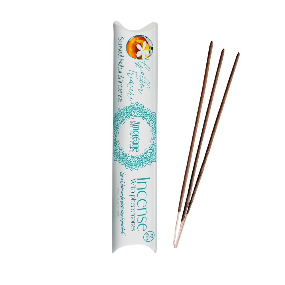 Погрузитесь в утончённую атмосферу с аромапалочками Golden Treasure с феромонами. Их нежный аромат жасмина, переплетённый с мягкими мускусными нотами, создаёт изысканную обстановку и усиливает чувственность в интимные моменты. При зажигании палочки наполняют пространство глубоким, чарующим ароматом, превращая его в настоящий взрыв страсти и эмоций. Феромоны, входящие в состав, пробуждают желание, усиливают притяжение и настраивают вас и вашего партнёра на волну наслаждения. Golden Treasure — это аромат, который раскрывает чувственность и превращает близость в драгоценный опыт.